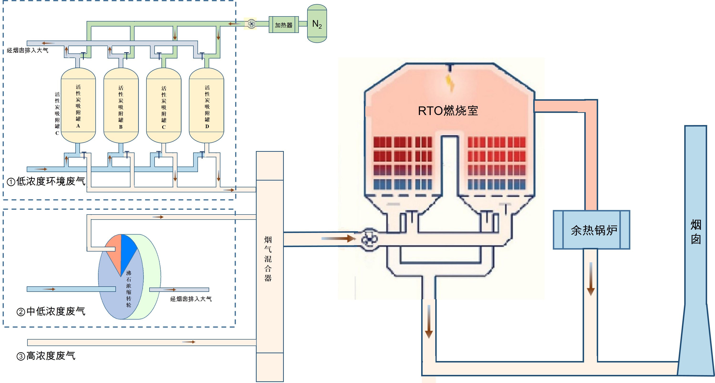 通常涂料或涂装工厂的厂区存在多个VOCs的排放点、VOCs的浓度分布不均等特点,单独的处理工艺很难解决全厂的VOCs排放问题。可采用创新性地开发了“活性炭氮气脱附+沸石浓缩+RTO”组合工艺,并在实际工程中得到了应用,该工艺能够全方位的治理涂料或涂装厂区的VOCs废气。该工艺的示意图如下图所示: